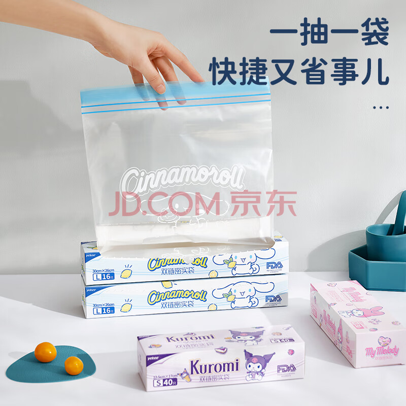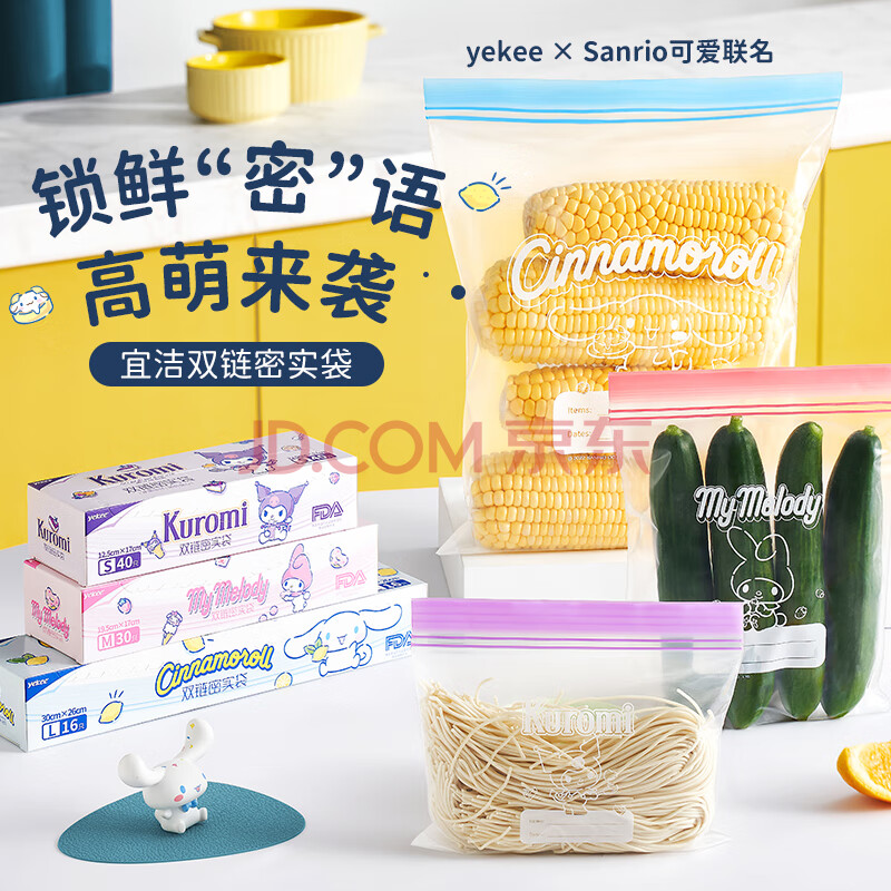 商品相册:宜洁(yekee)双链密封袋三丽鸥联名食品加厚保鲜盒装19.5cm*17cm*60只JD-8975第