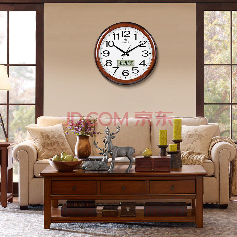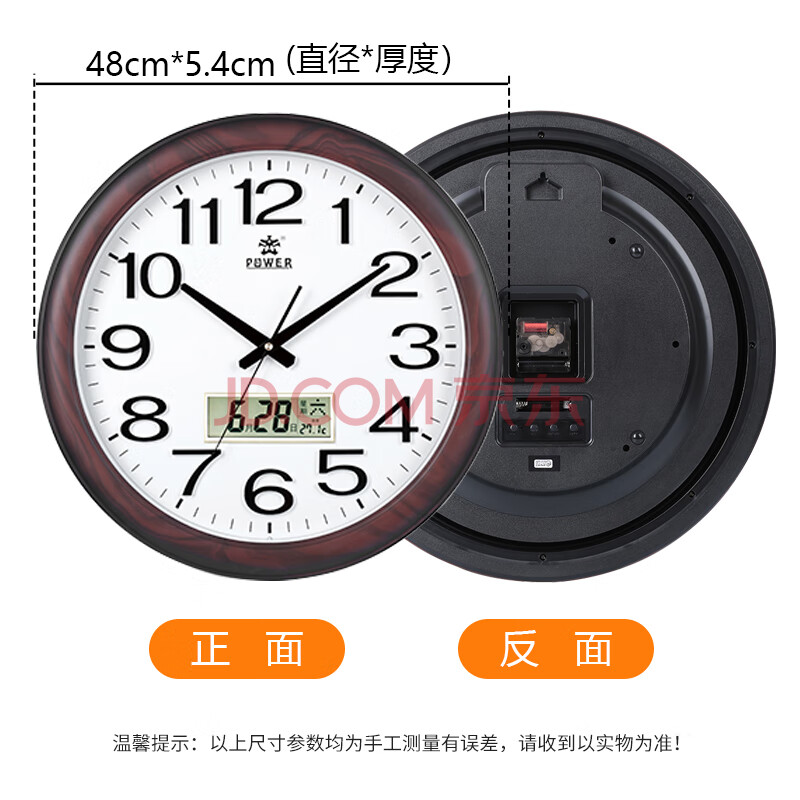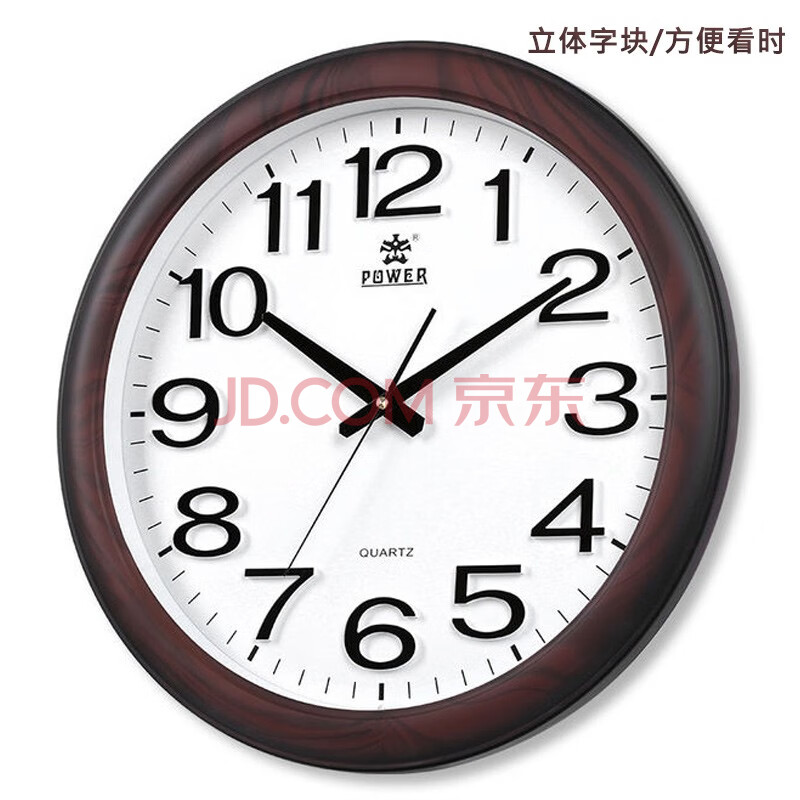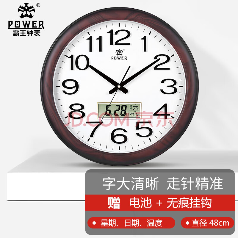商品相册:POWER霸王挂钟表 大号中式仿木客厅圆形石英钟日历挂墙48cm0572第