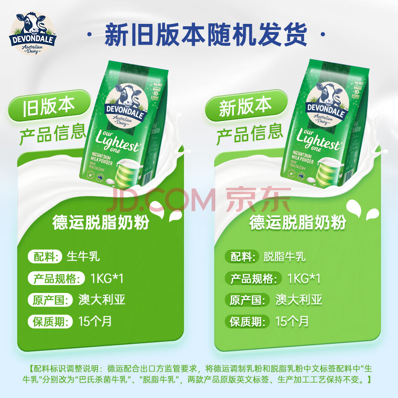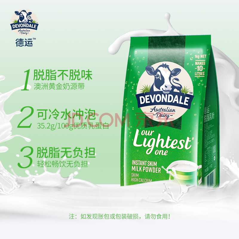 商品相册:德运(Devondale)脱脂成人奶粉1kg袋装脱脂乳粉学生儿童奶粉高钙澳洲原装进口早餐第