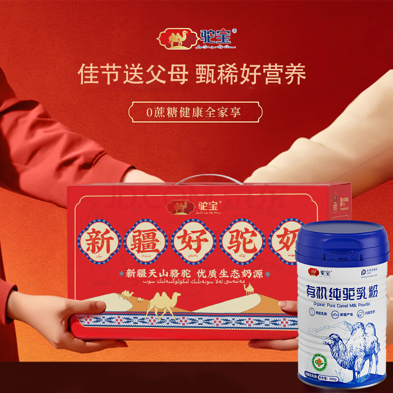商品相册:驼宝有机骆驼奶粉新疆正宗全脂骆驼乳粉成人中老年驼奶粉300g*5罐礼盒第