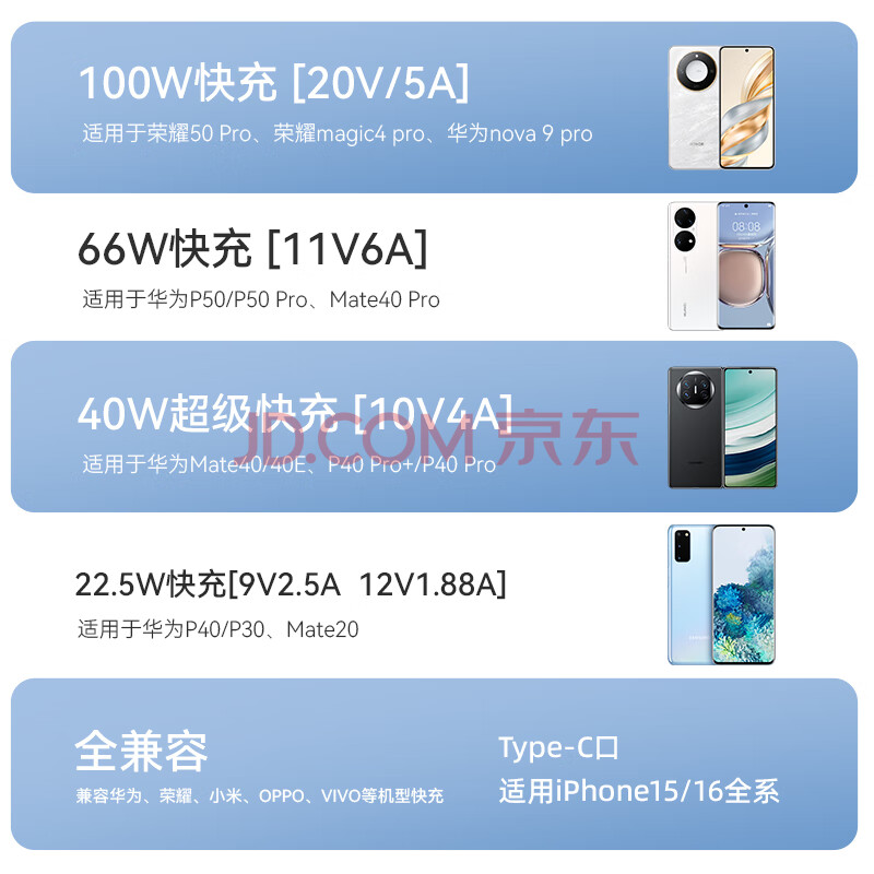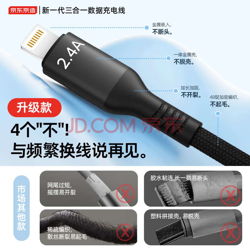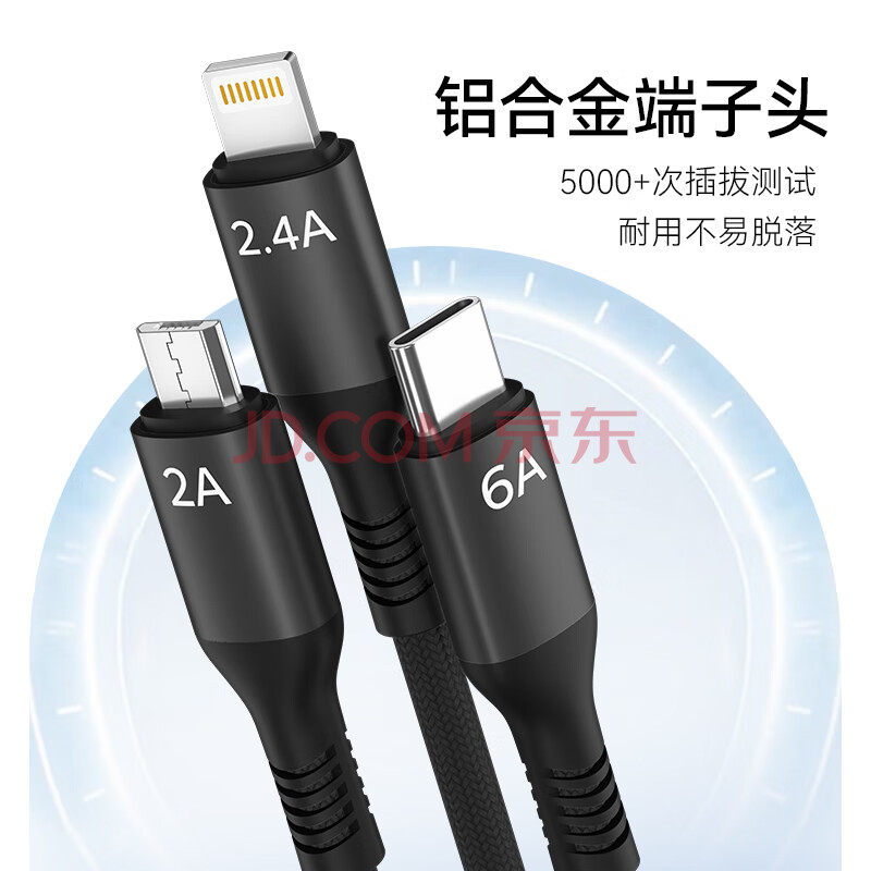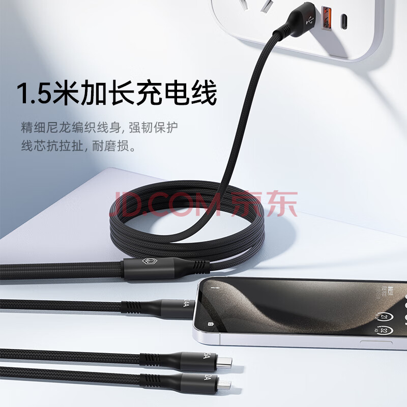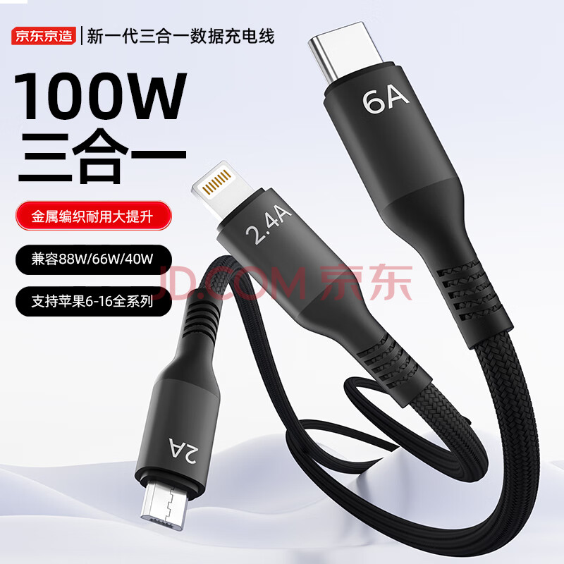 商品相册:京东京造三合一充电线100W/88W/66W快充数据线一拖三头Type-C适用于安卓iPhone苹果华为小米手机车载编织线第