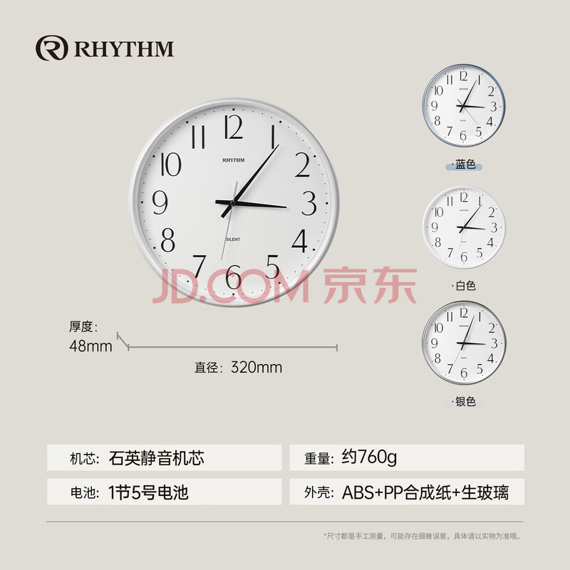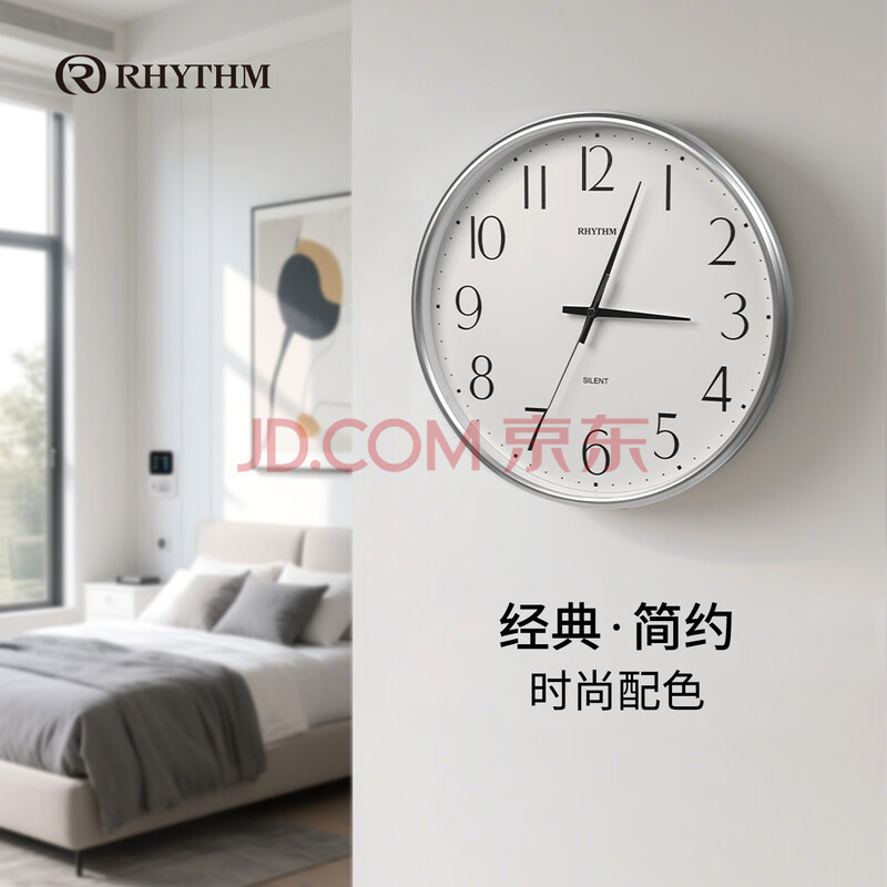 商品相册:丽声(RHYTHM)表卧室家用表挂墙时钟32cm炫银CMG529XC19简约挂钟超大第