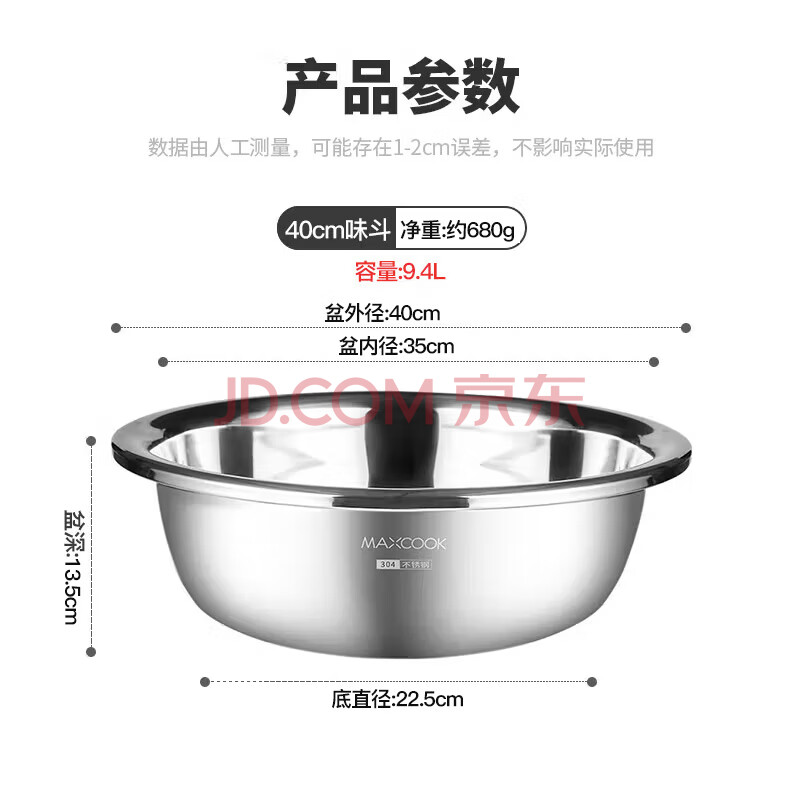 商品相册:美厨(MAXCOOK)304不锈钢盆洗菜盆调料盆 加大加厚味斗40cm 和面拌沙拉个MCWA517第1张/共8