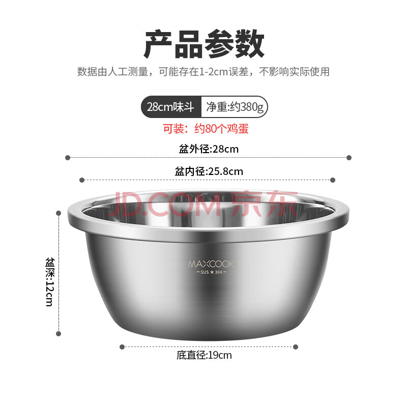 商品相册:美厨(maxcook)304不锈钢盆调料盆 加大加厚味斗28CM 洗菜盆沙拉盆和面盆MCWA666第