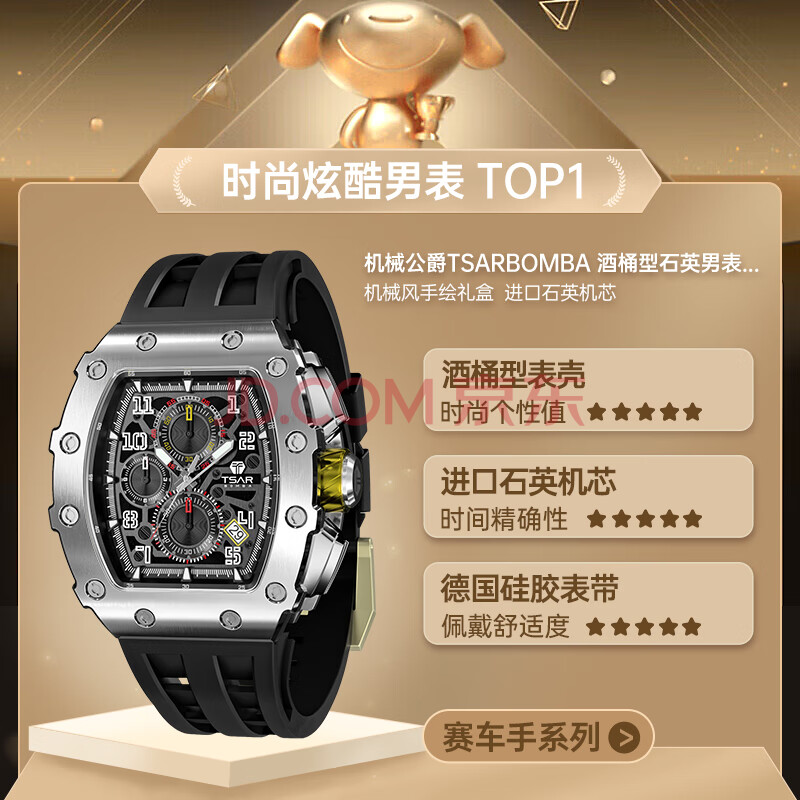 商品相册:机械公爵(TSAR BOMBA)赛车系列男士自学生营品牌酒桶型石英国瑞腕手表圣诞新年送男友第