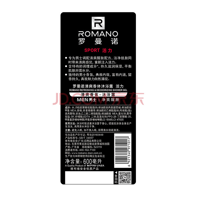 商品相册:罗曼诺(ROMANO)沐浴露男士 持久留香滋润保湿香水沐浴乳 活力净爽醒肤600g第
