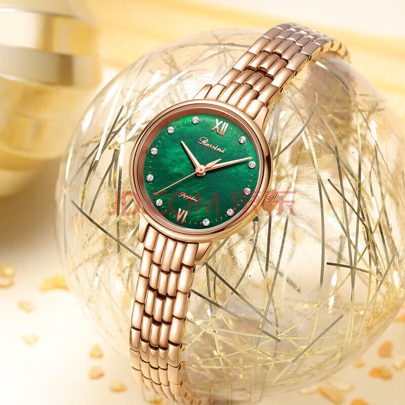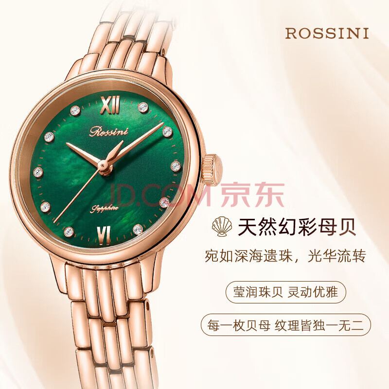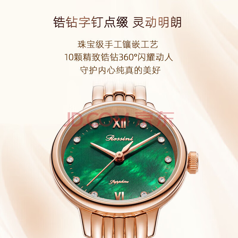 商品相册:罗西尼(ROSSINI)手表女石英表绿盘钢带生日礼物送女友国表气质贝母小绿表 5220118第
