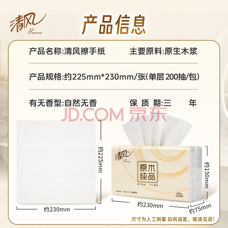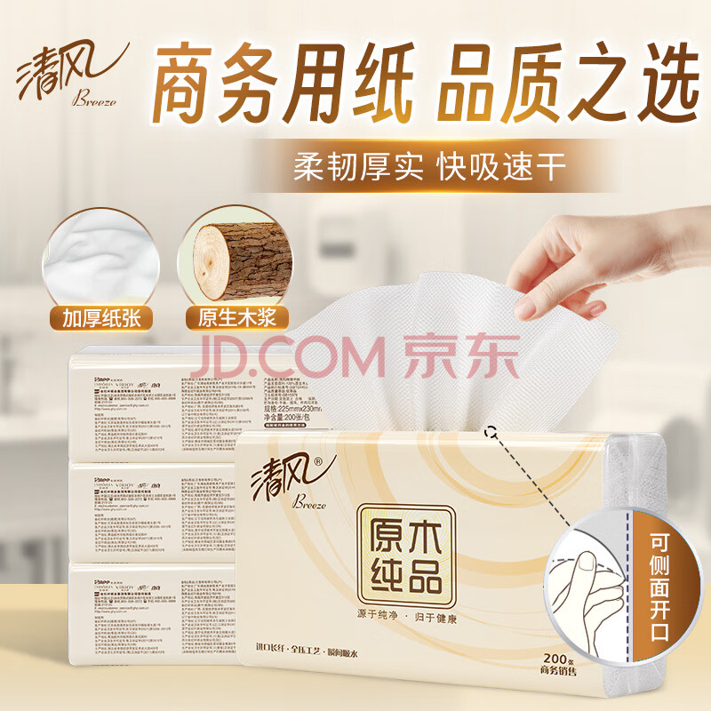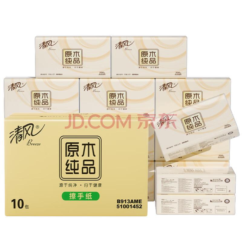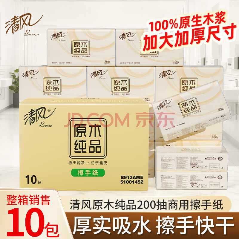 商品相册:清风擦手纸1层200抽*10包商用酒店卫生间厕所抹手纸抽取式纸巾B913AME第