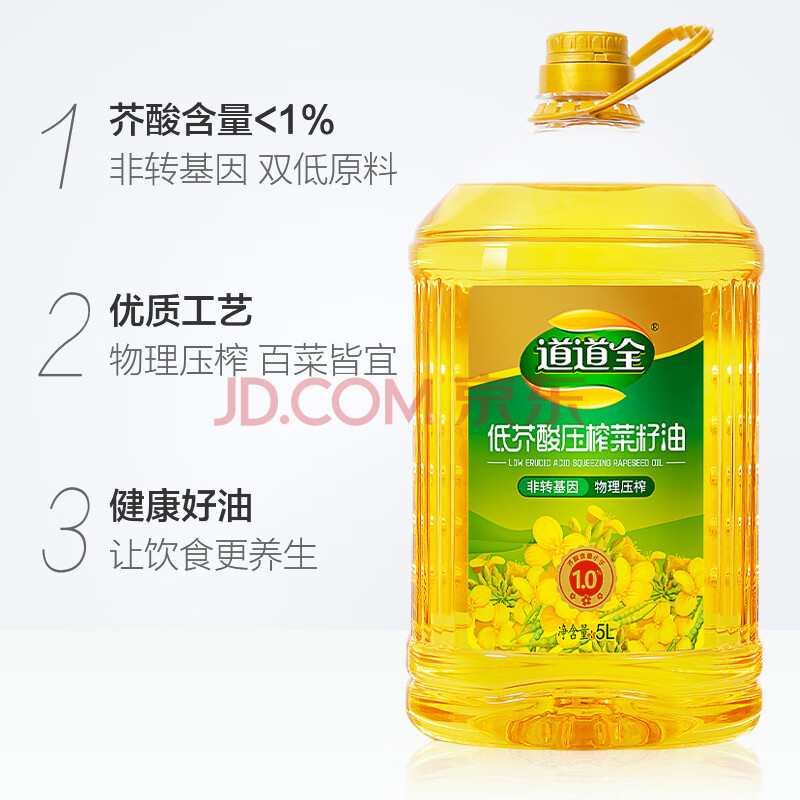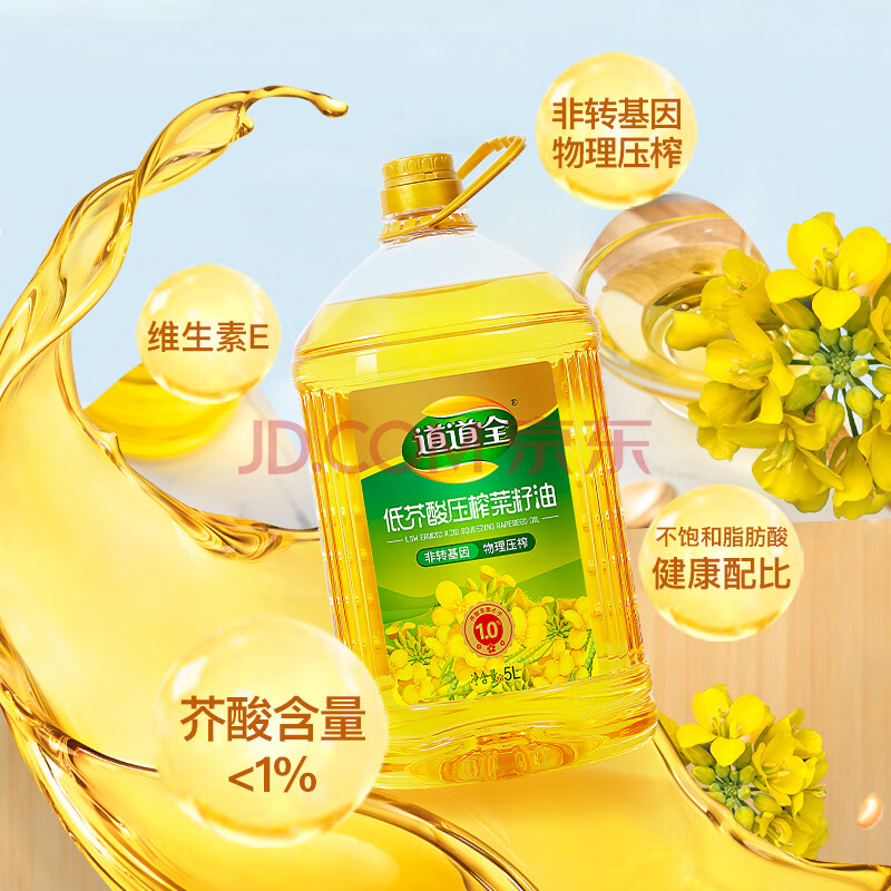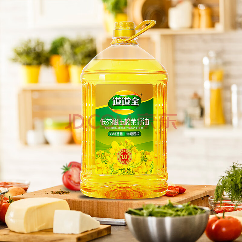 商品相册:道道全【保真菜籽油】食用油 低芥酸压榨菜籽油 芥酸含量<1% 5L*1桶第