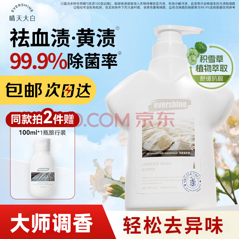 商品相册:EVERSHINE晴天大白内衣裤洗衣液500ml内衣内裤除菌去血渍孕婴专用清洗液第