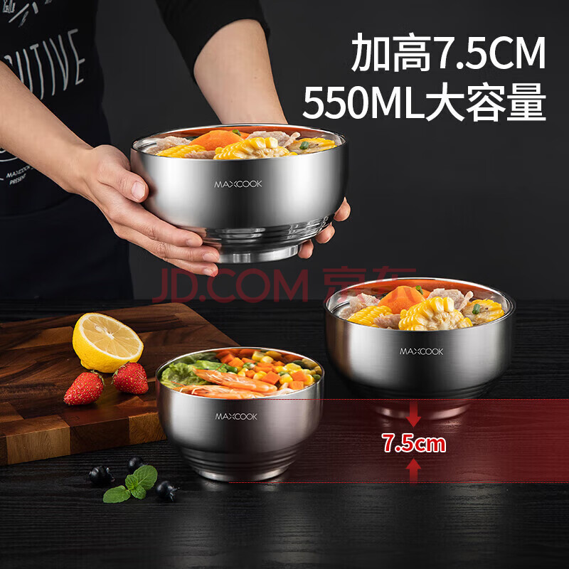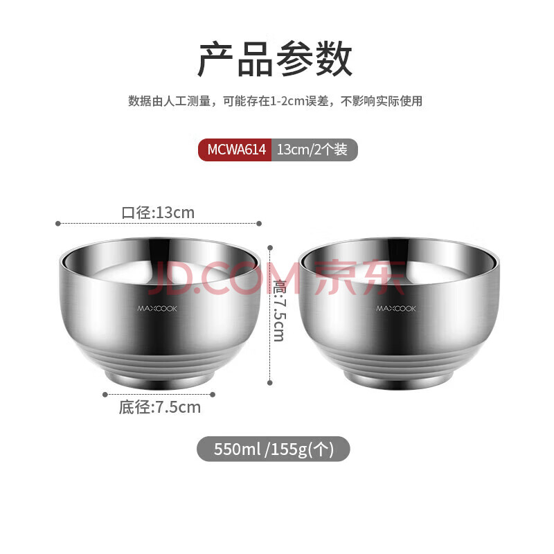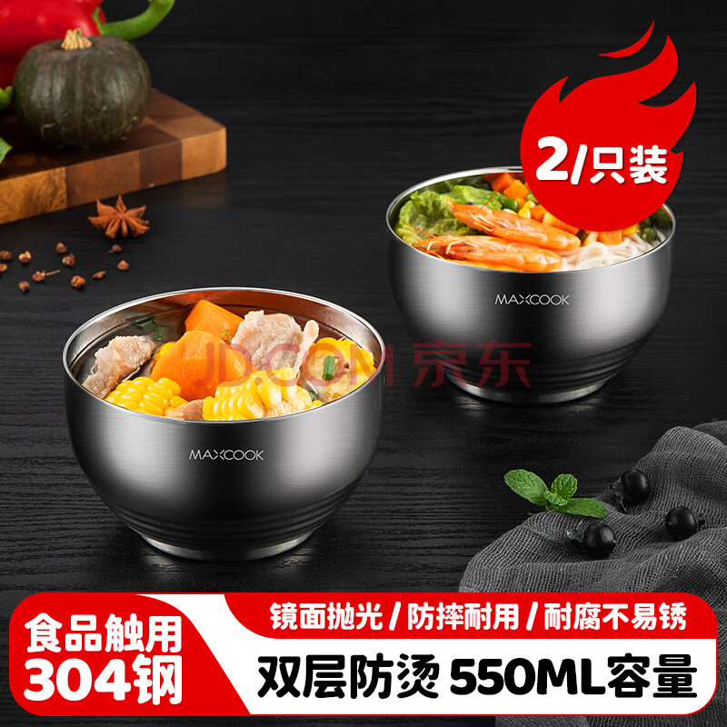 商品相册:美厨(MAXCOOK)304不锈钢碗 汤碗双层隔热 餐具面碗13CM(2只装)MCWA614第