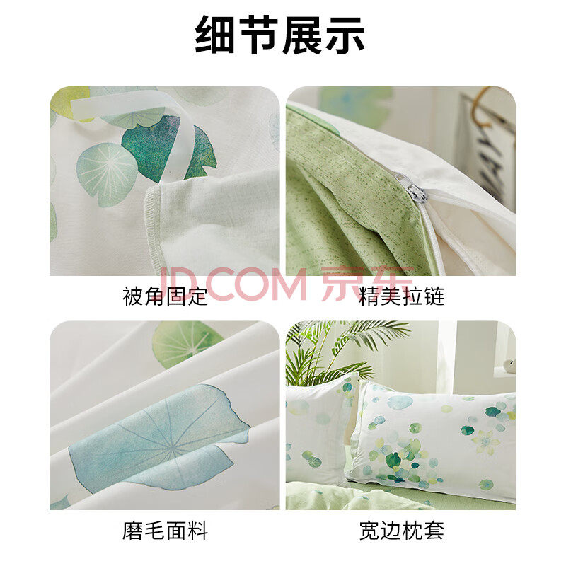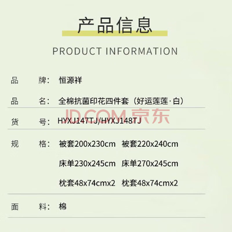 商品相册:恒源祥全棉四件套抗菌印花超软亲肤床品套件(被套2.2*2.4m)好运莲莲白第