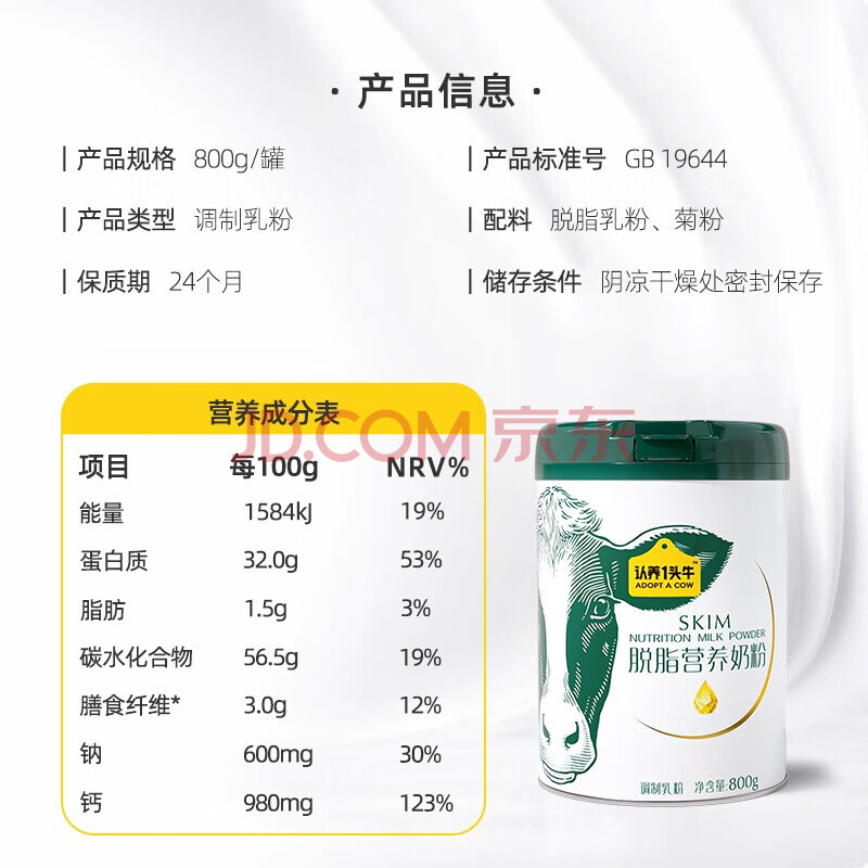 商品相册:认养一头牛脱脂奶粉 高钙 800g/罐 女士成人中老年 全家营养奶粉 送礼送父母第