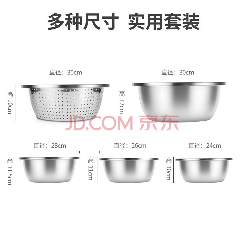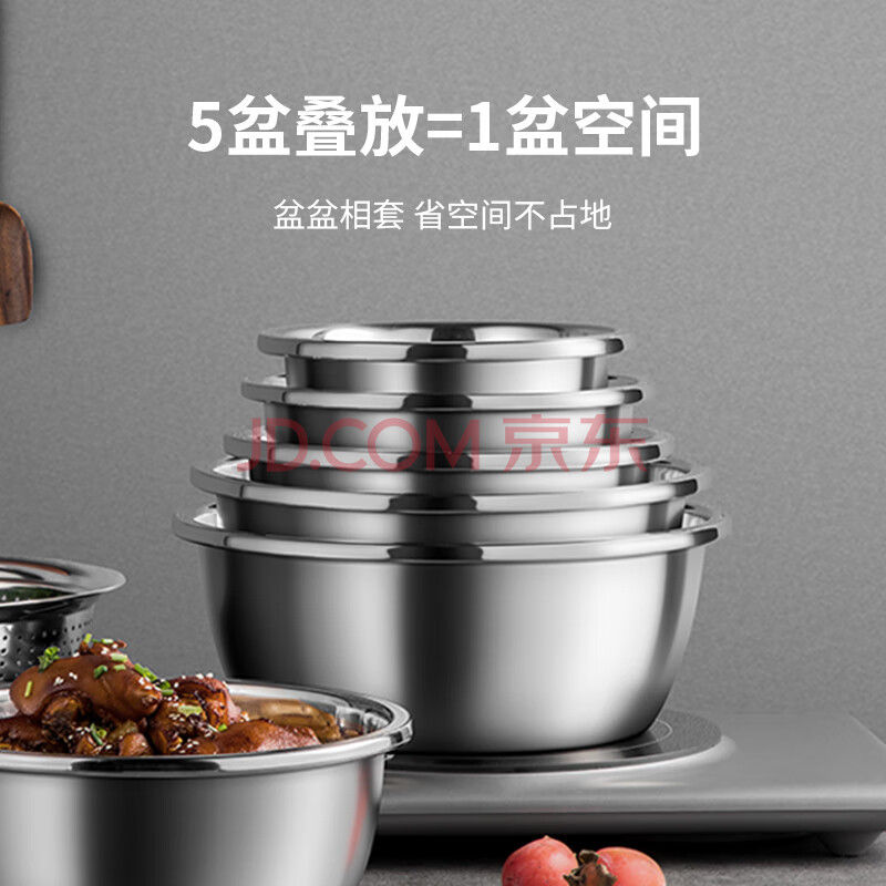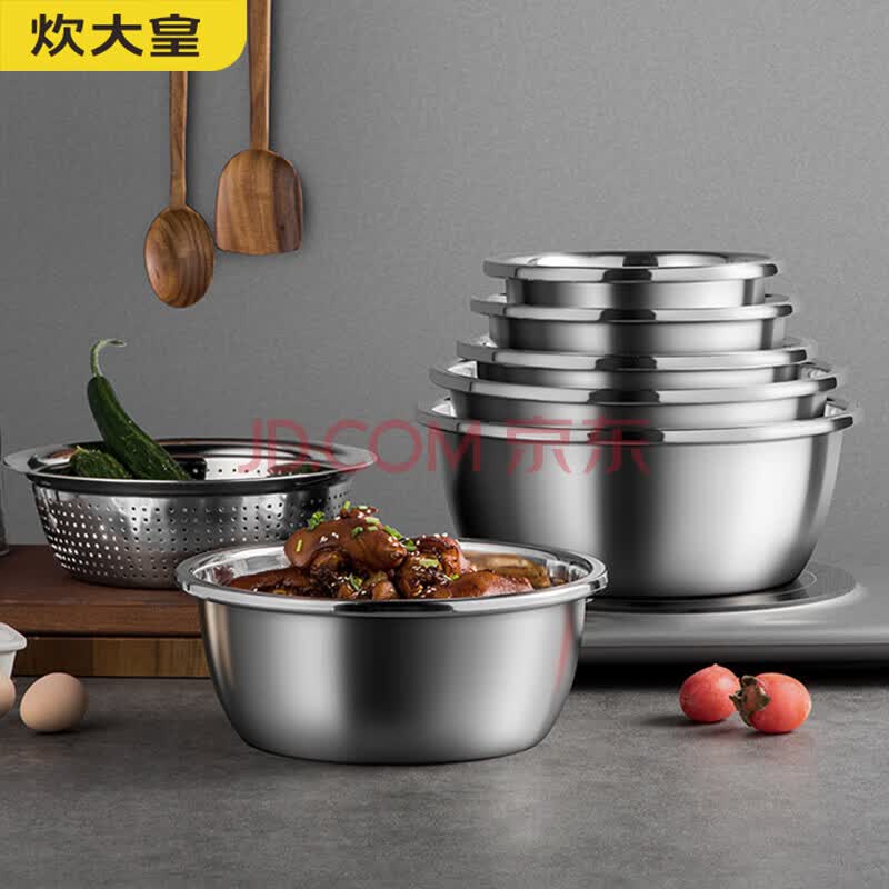 商品相册:炊大皇 不锈钢盆筛五件套304钢加大加厚洗菜盆沥水和面盆沙拉拌菜调料盆第