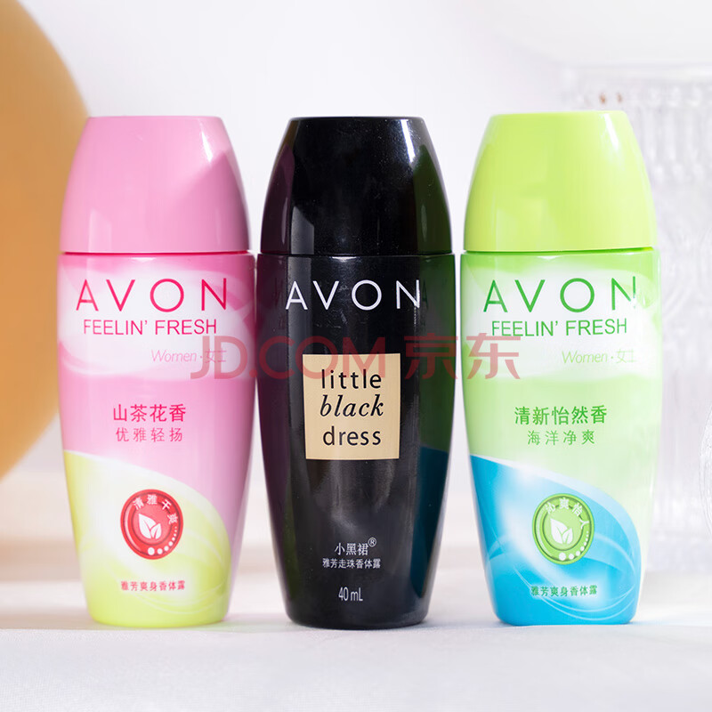 商品相册:AVON走珠香体露山茶花40ml+海洋40ml+小黑裙40ml效期至27.1.29第