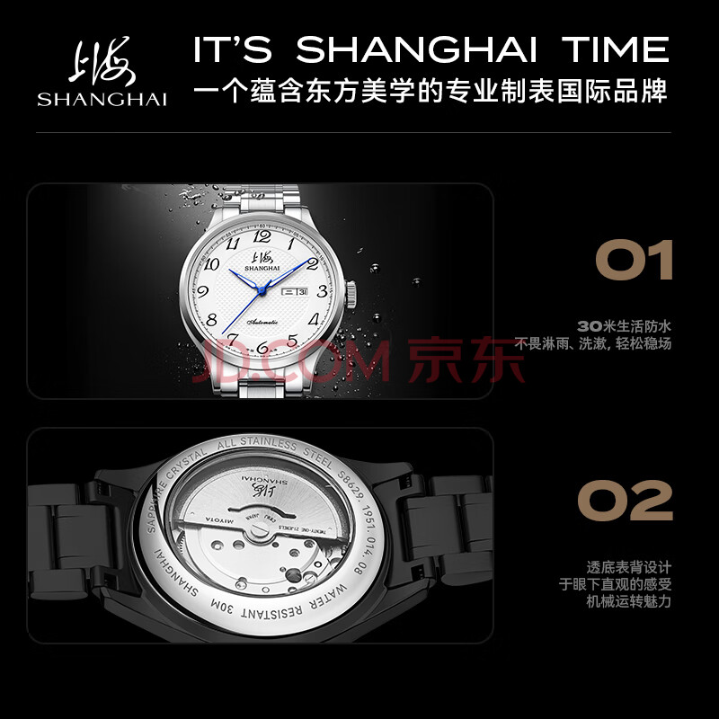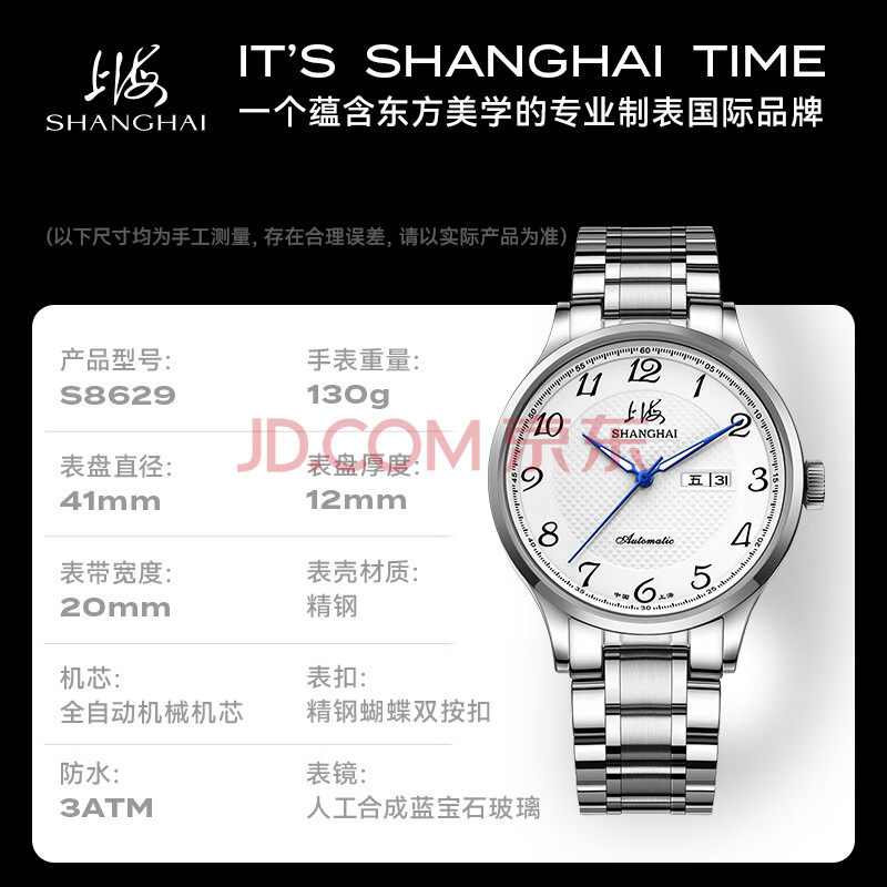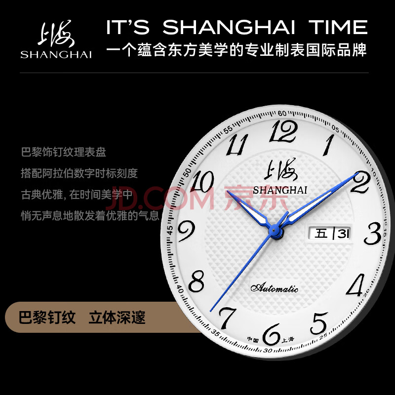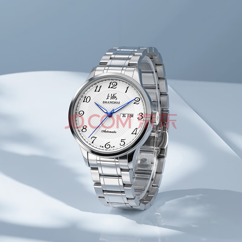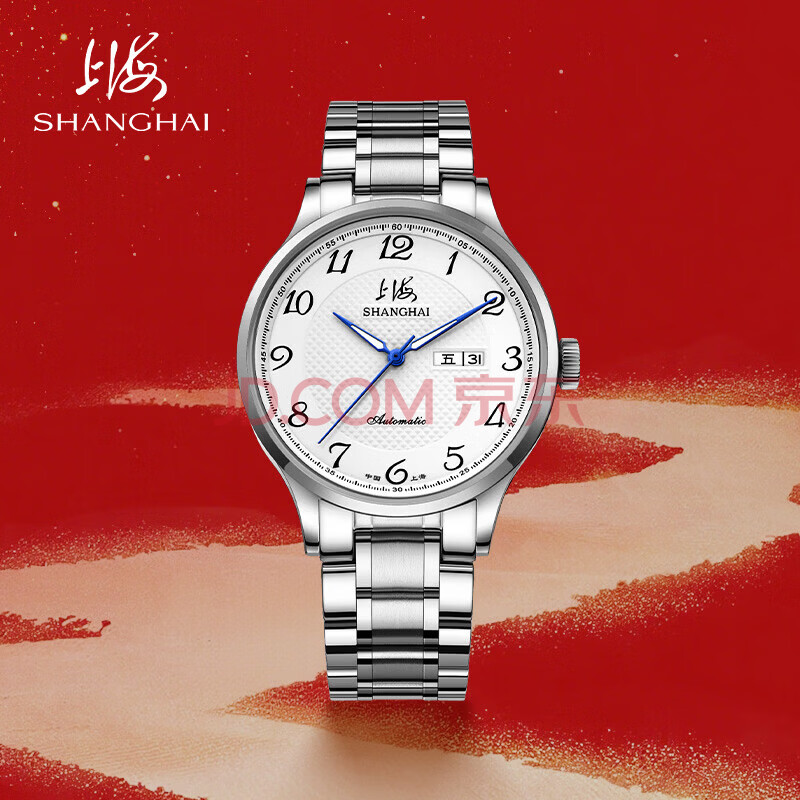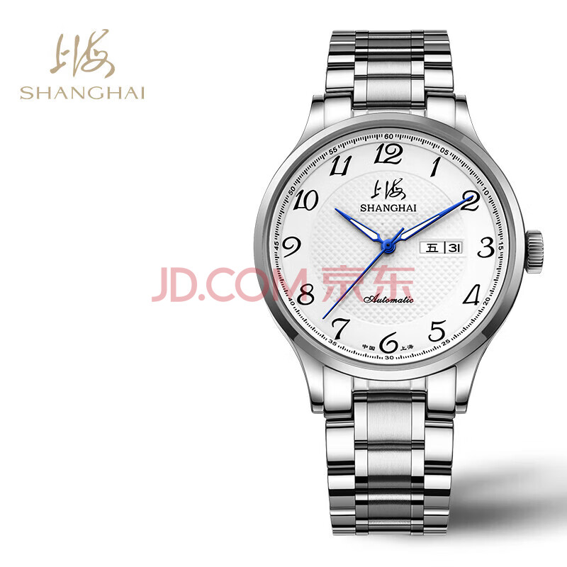 商品相册:上海(SHANGHAI)手表男款 国民系列 经典男士自动机械腕表钢带男款 S629B白双历第