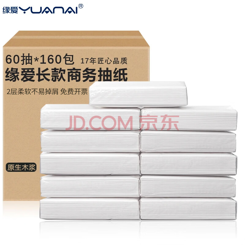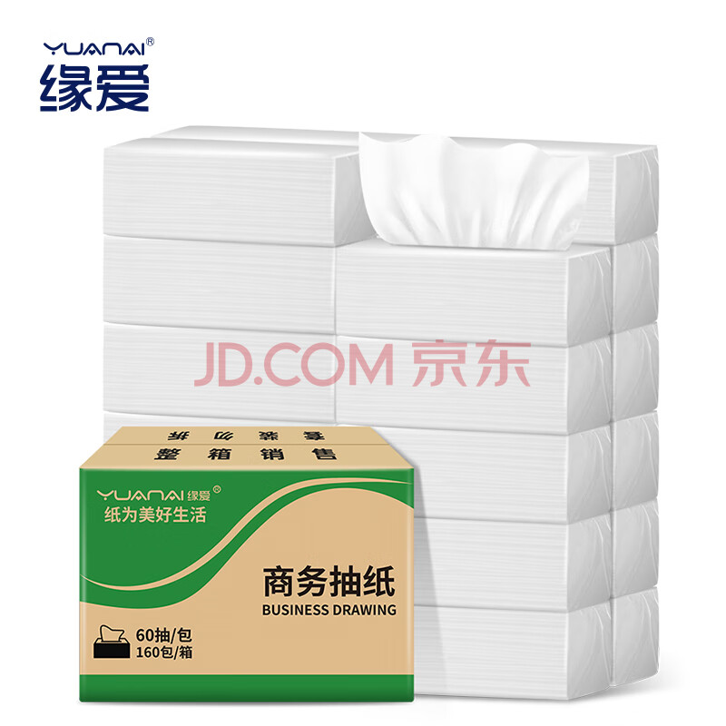 商品相册:缘爱商用抽纸 2层60抽*160包 宾馆酒店专用餐巾纸巾KTV长款面巾纸整箱第