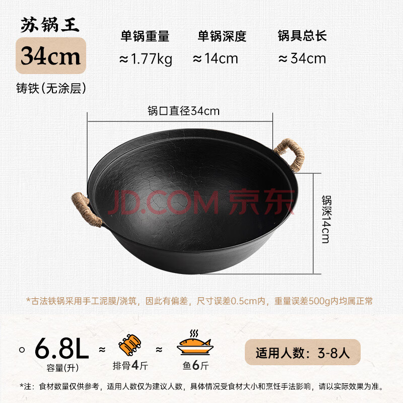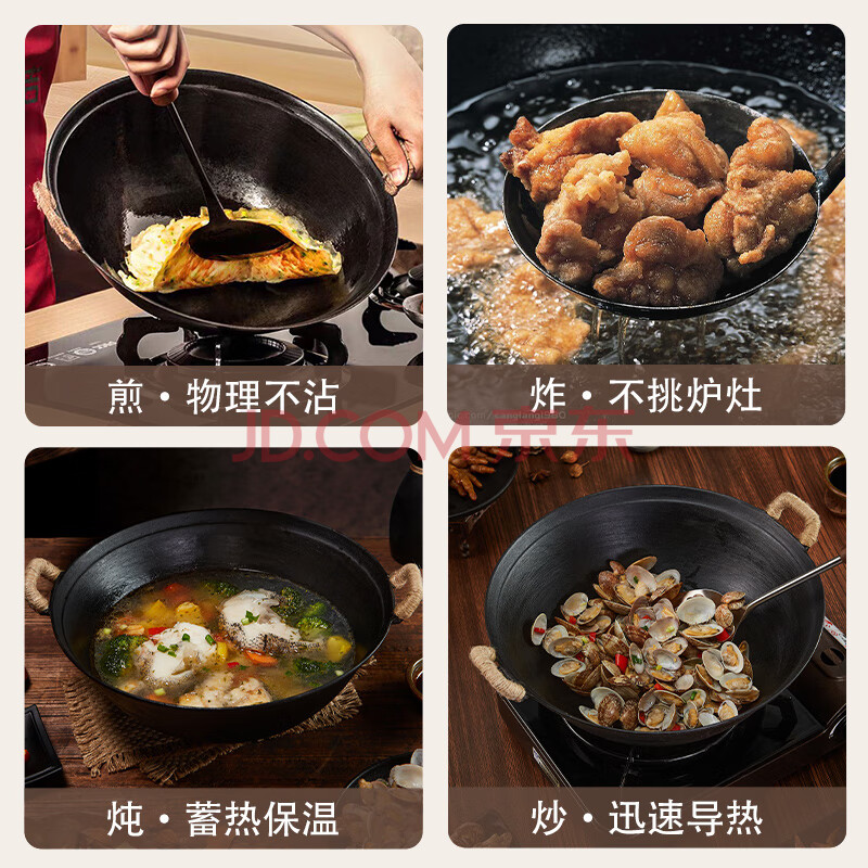 商品相册:王源吉铁锅炒锅双耳苏锅王厨房好物老式家用手工大肚龟纹圆底炒菜锅34cm第