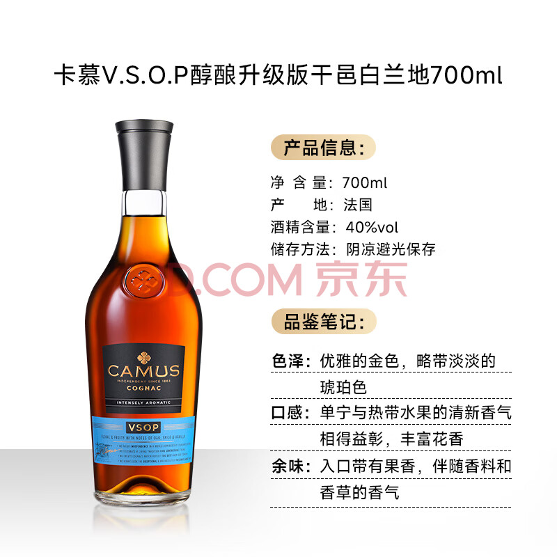 商品相册:卡慕(CAMUS) VSOP醇酿升级版 700ml 法国原装 干邑白兰地洋酒 40度第