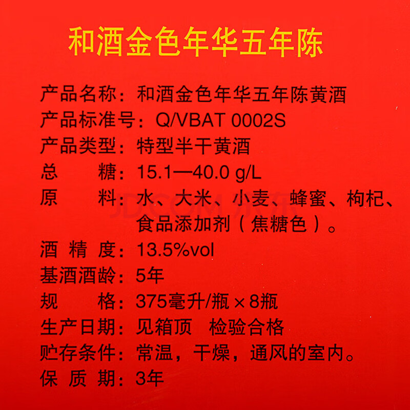 商品相册:和酒金色年华五年陈半干型 上海老酒 375ml*8瓶 上海老酒送礼礼盒第