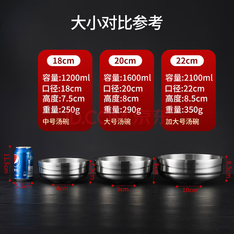 商品相册:美厨(MAXCOOK)304不锈钢碗 大汤碗双层隔热 餐具面碗22CM MCWA106第