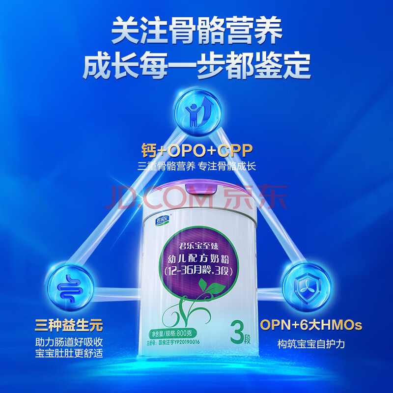 商品相册:君乐宝至臻3段幼儿配方奶粉(12-36月龄)800g*3罐专注宝宝骨骼成长第