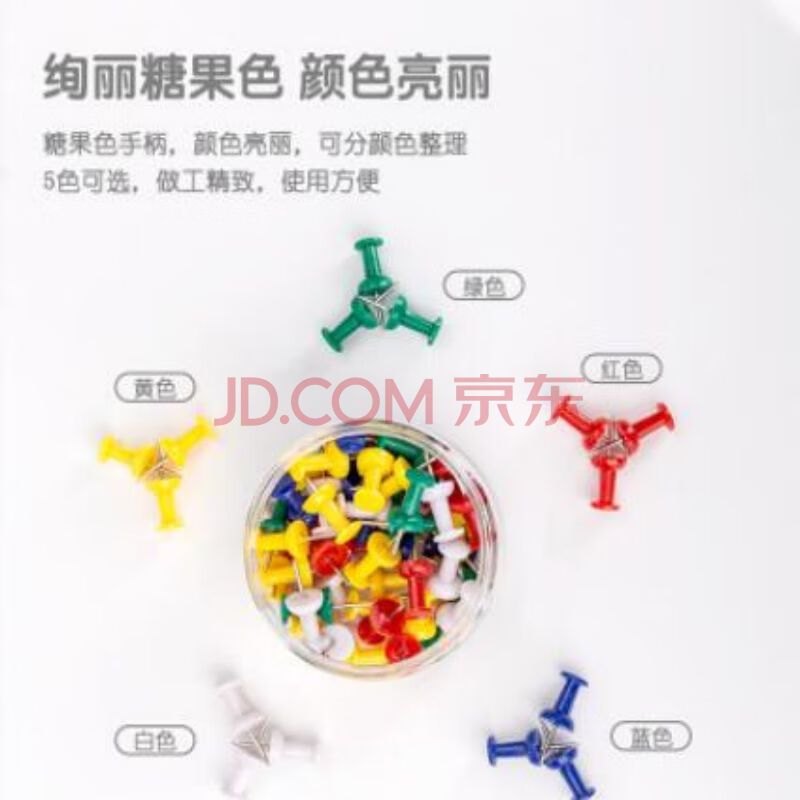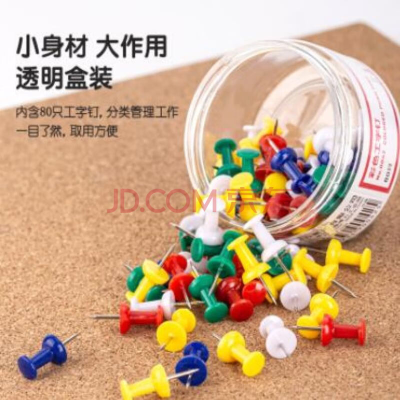 商品相册:得力(deli)0042彩色工字钉 大头钉图钉金属不锈钢多色混合(80枚/筒)10筒装第