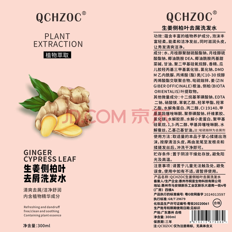 商品相册:QCHZOC生姜侧柏叶清爽去屑洗发露洁净舒润洗发水300ml第