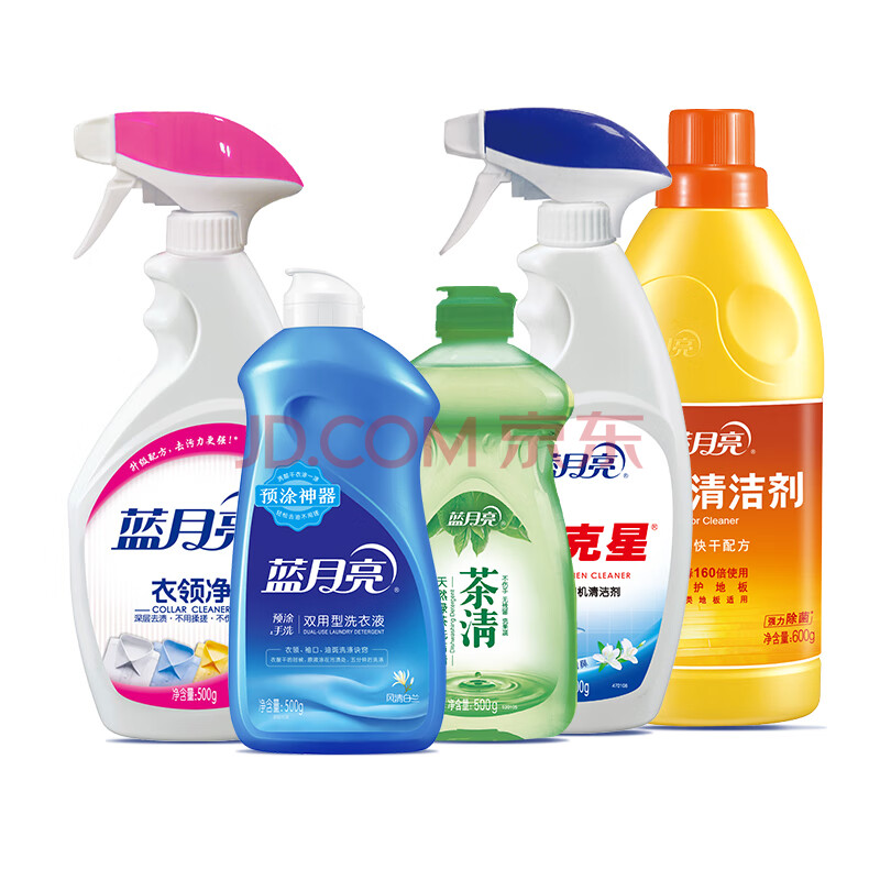 商品相册:蓝月亮家庭清洁五件套2.6kg(洗衣液+衣领净+油污克星+洗洁精+地板水)第