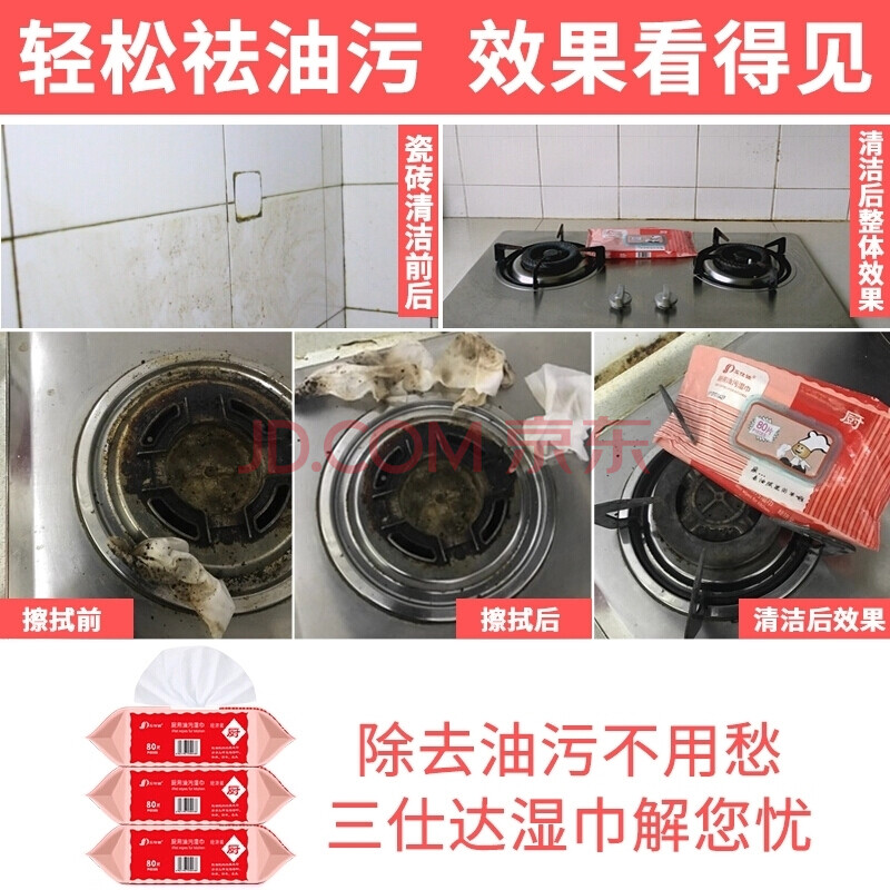 商品相册:三仕达厨房湿巾80片*3包去油去污湿纸巾厨具灶具烟机家用卫生清洁吸油纸第