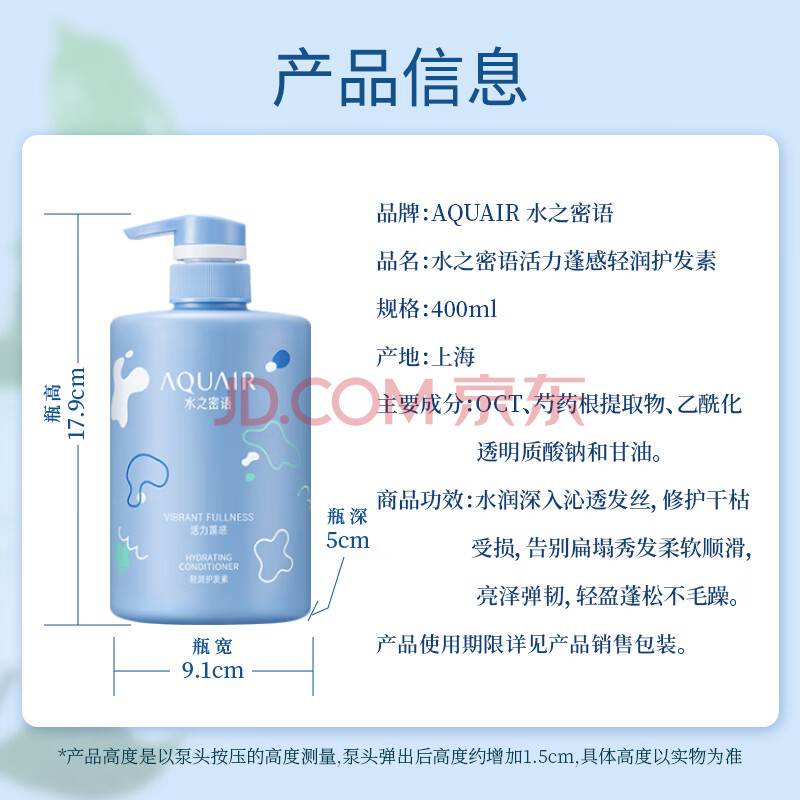 商品相册:水之密语(AQUAIR)活力蓬感护发素400ml柔顺蓬松护发乳修护干枯改善毛躁润发乳第