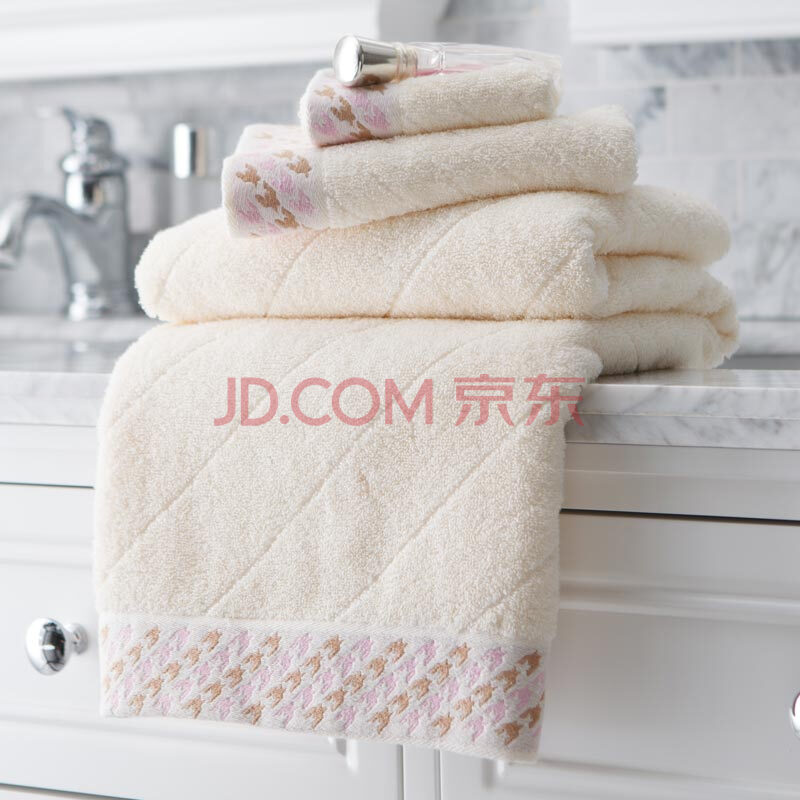 商品相册:洁丽雅(Grace)纯棉提花千鸟格加厚吸水毛巾浴巾礼盒三件套 米色第