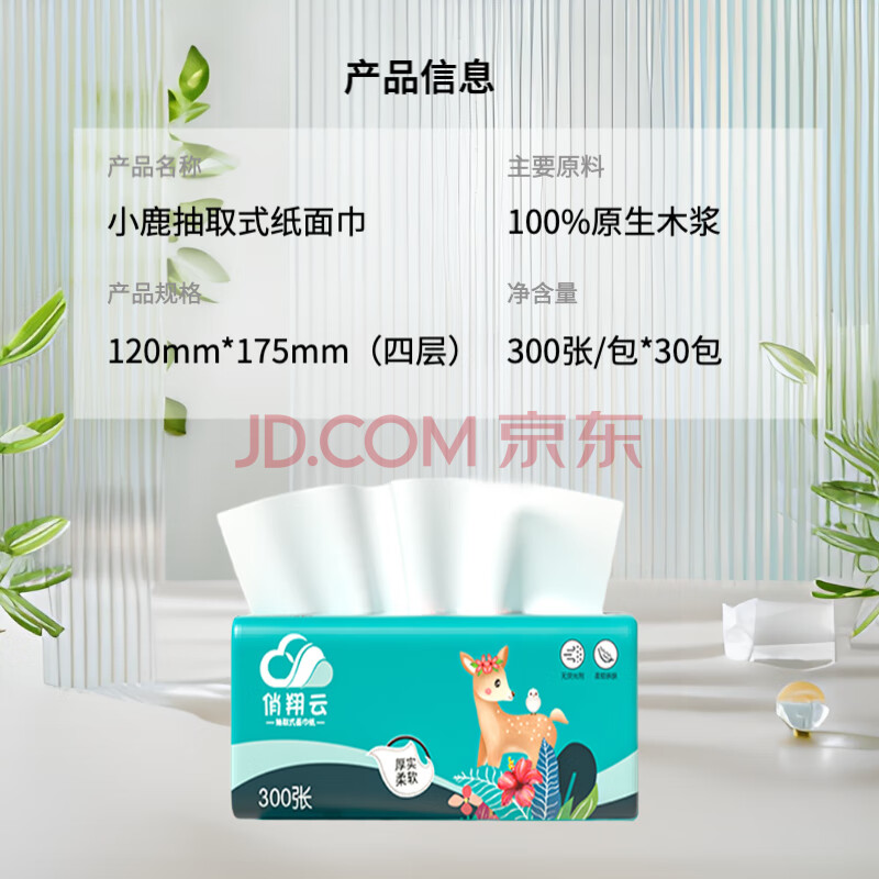 商品相册:俏翔云森屿鹿语抽纸4层300张*30包原木家用纸巾卫生纸整箱源头直发包邮第