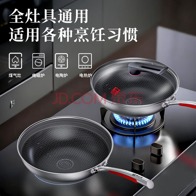 商品相册:康巴赫炒锅不粘锅316L不锈钢炒菜锅32cm蜂窝平底煎炒锅电磁炉燃气灶通用第