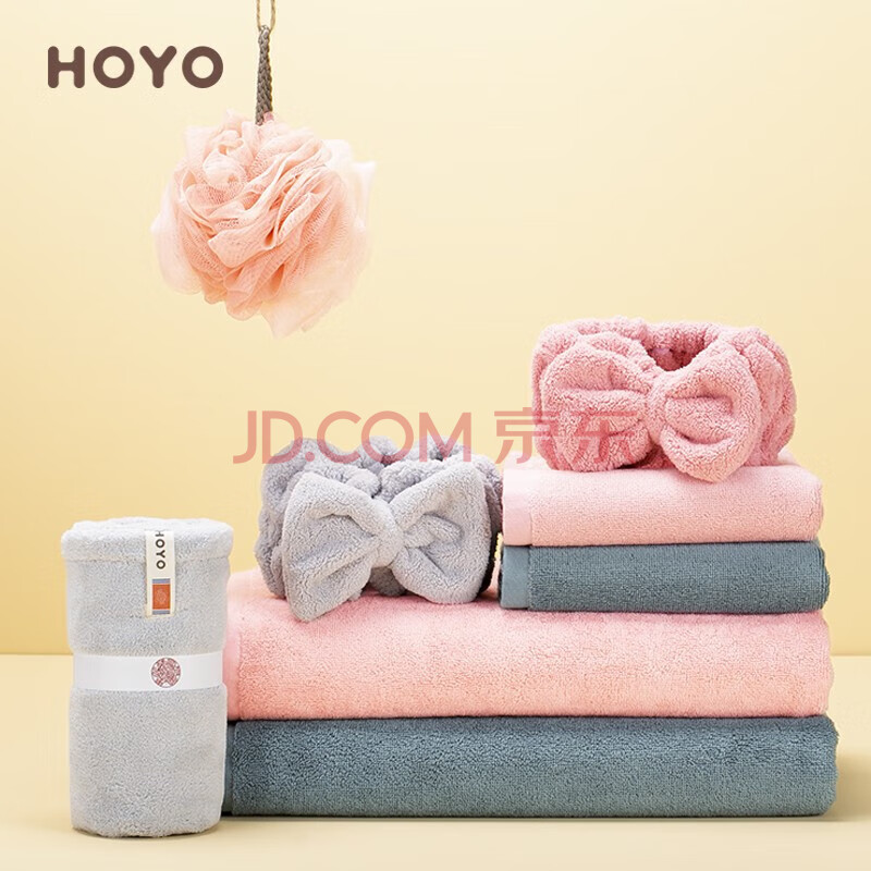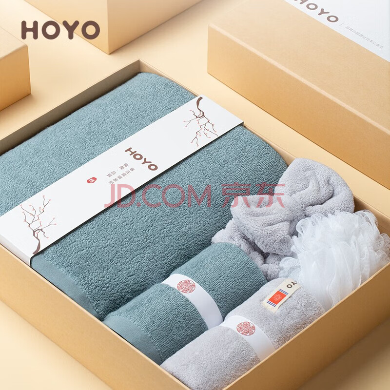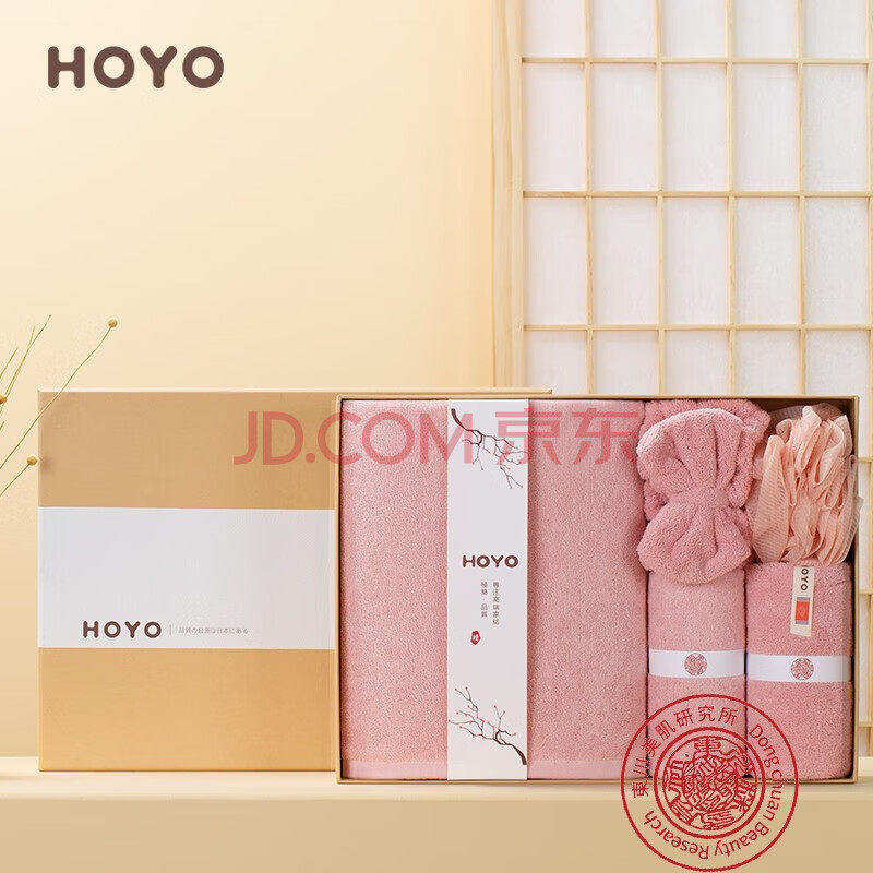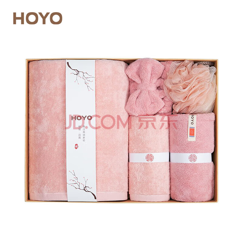 商品相册:HOYO日本毛浴巾干发帽束发带浴花洗漱5件套 伴手礼回礼高档定制礼盒第