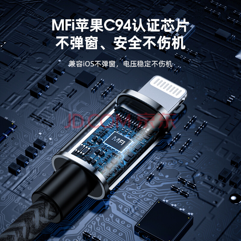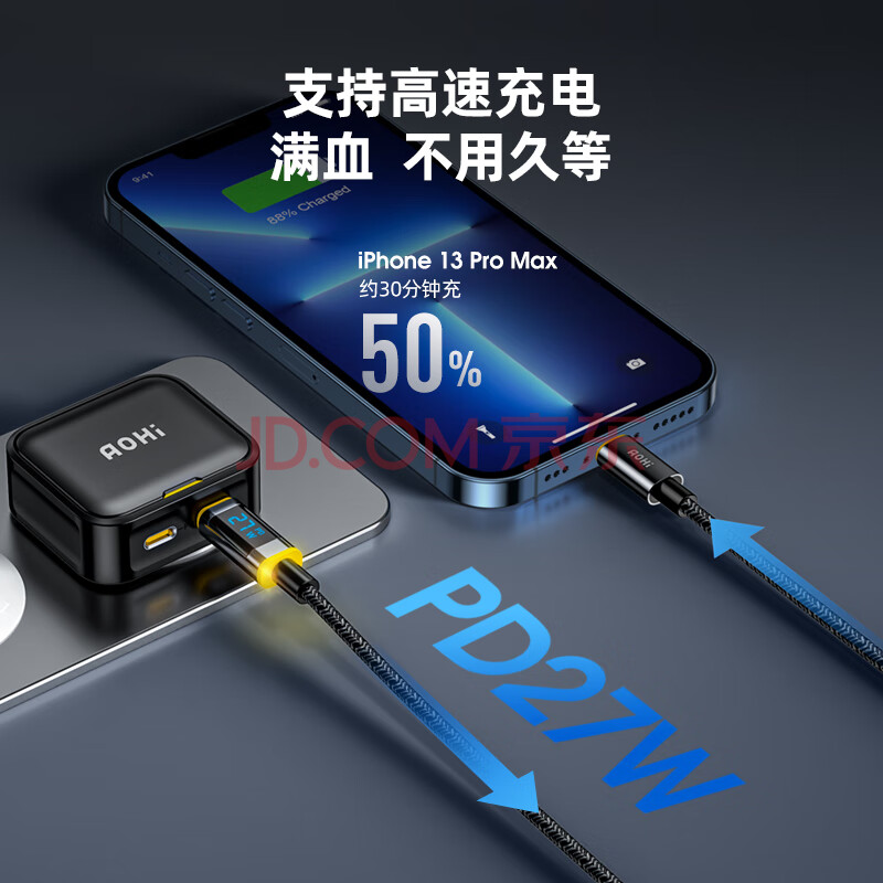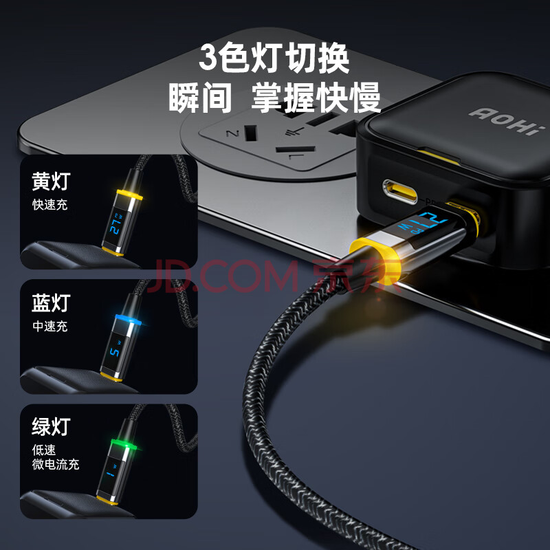 商品相册:Aohi 奥海MFI认证数显线C-Lightning苹果快充线PD黑色1.2米3A编织线带指示灯适用于iphone13/12/ipad第1张/共5