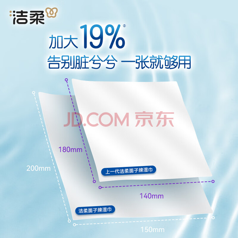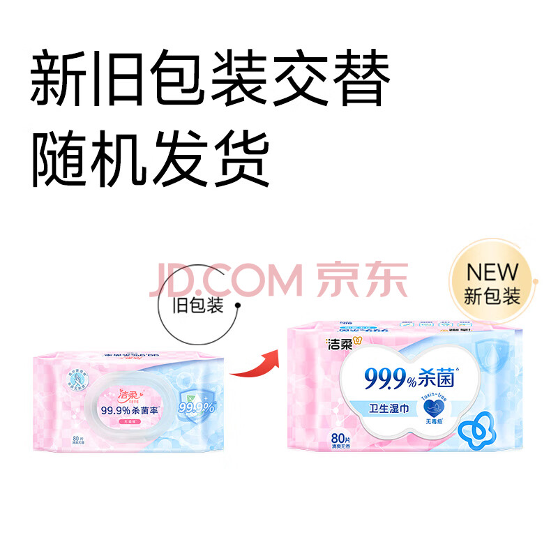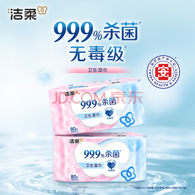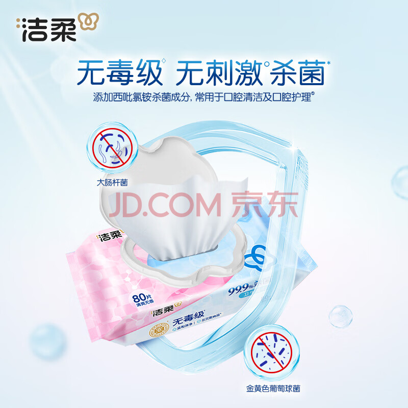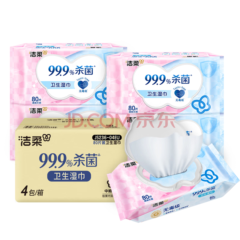 商品相册:洁柔卫生湿巾加厚80抽4包湿巾纸99.9%杀菌清洁RO纯水呵护敏感肌肤整箱第