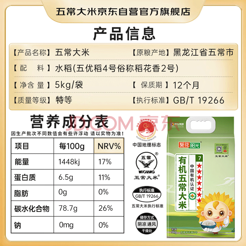 商品相册:五常大米官方溯源 葵花阳光 特等五常大米 10斤 原粮稻花香2号 有机 新米第