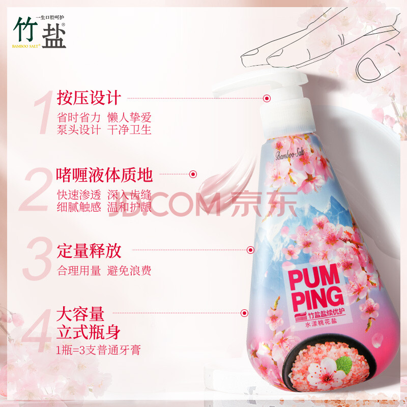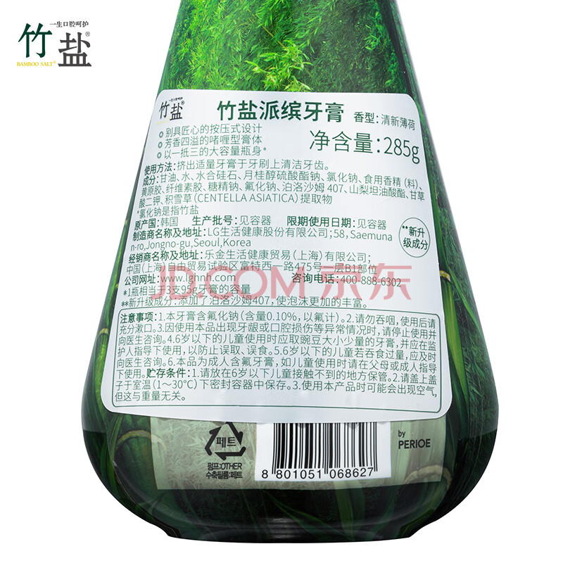 商品相册:竹盐LG派缤按压式牙膏285g*2瓶组套(清新薄荷+桃花盐)轻牙渍清洁口腔第