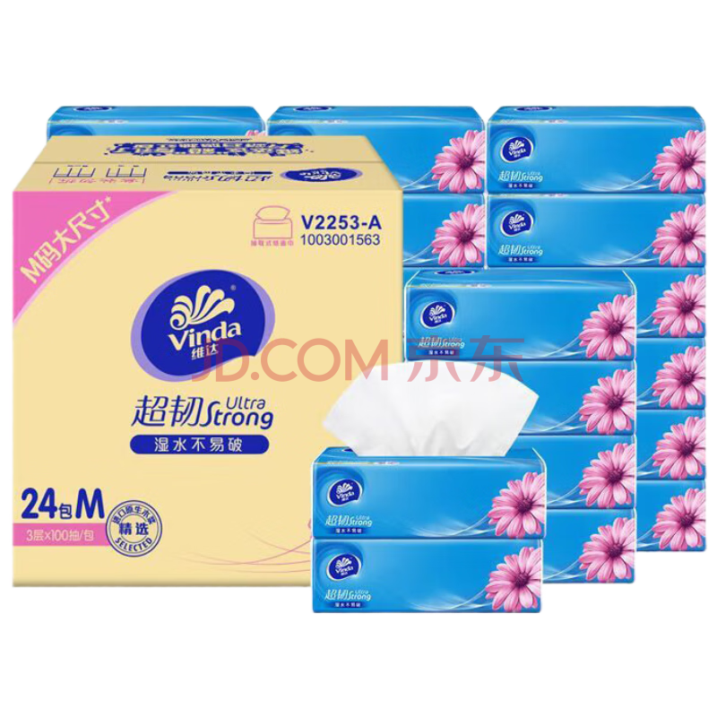商品相册:维达 抽纸 超韧24包*3层100抽 M码整箱 湿水不易破卫生纸(随机发货)第