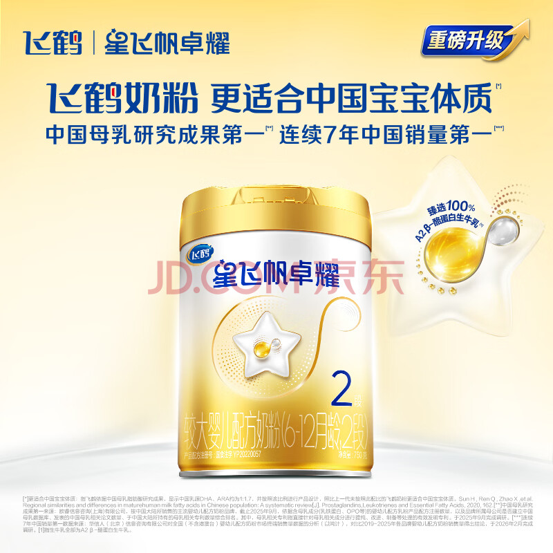 商品相册:飞鹤星飞帆卓耀A2 β-酪蛋白奶源 婴幼儿配方奶粉2段(6-12月)750g*6罐第