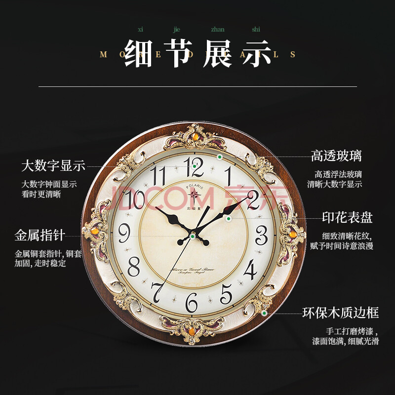 商品相册:北极星(POLARIS)挂钟欧式自动对时客厅钟表创意石英钟仿古时钟40cm木纹色第