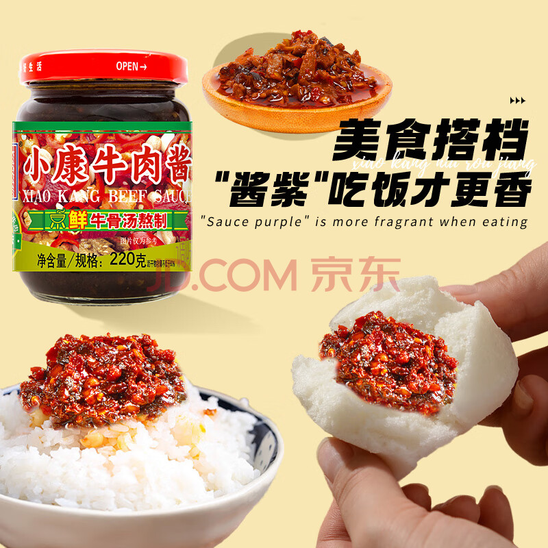 商品相册:小康牛肉酱甜辣味220g 16%生牛肉含量下饭菜火锅调料拌面辣椒酱第