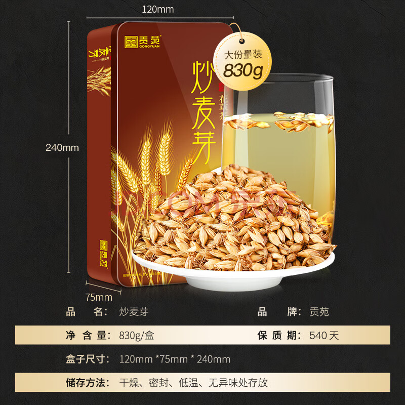 商品相册:贡苑 炒麦芽茶原味830g 原麦醇香大麦茶回独立大包装奶香花草养生茶第