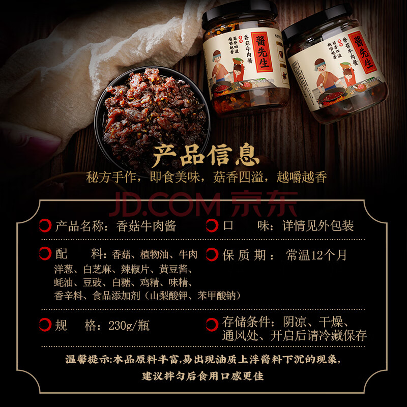 商品相册:酱先生香辣香菇牛肉酱230g 拌面拌饭调味酱调味料辣酱下饭菜第