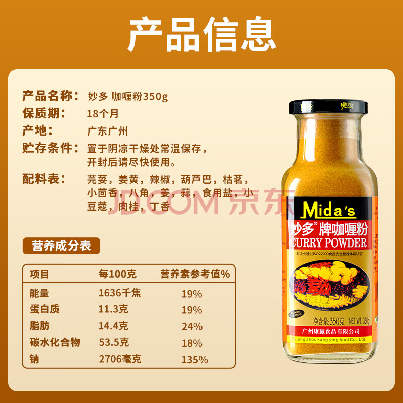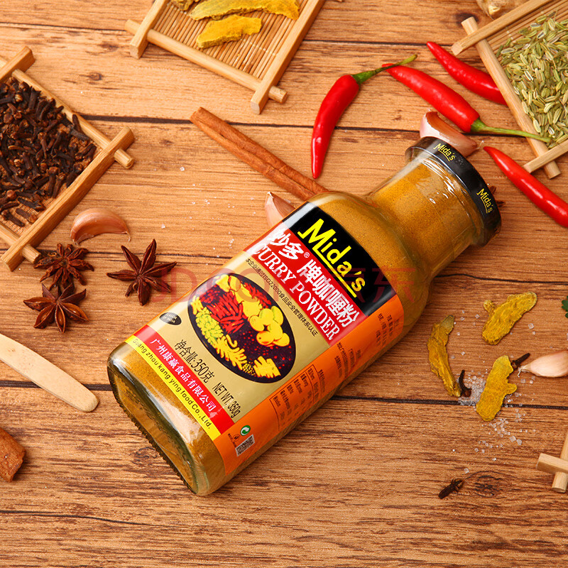 商品相册:妙多(mida's)咖喱粉 咖喱饭调味料印度风味黄咖喱鸡块牛肉腌料大瓶玻璃装350g第