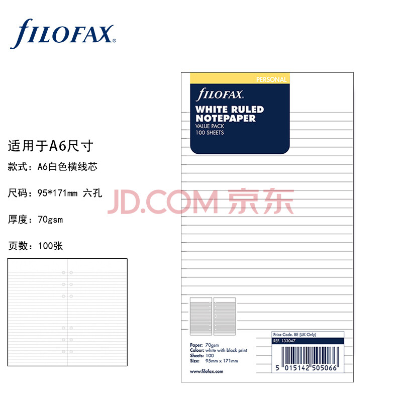 商品相册:Filofax 内页替芯 活页记事本替换芯 适用于A6尺寸 横线页 内芯 133047第