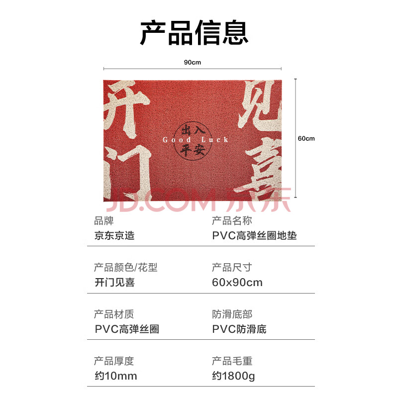 商品相册:京东京造 开门见喜 丝圈进门家用刮土防尘脚垫门垫入户防滑子垫60*90cm第