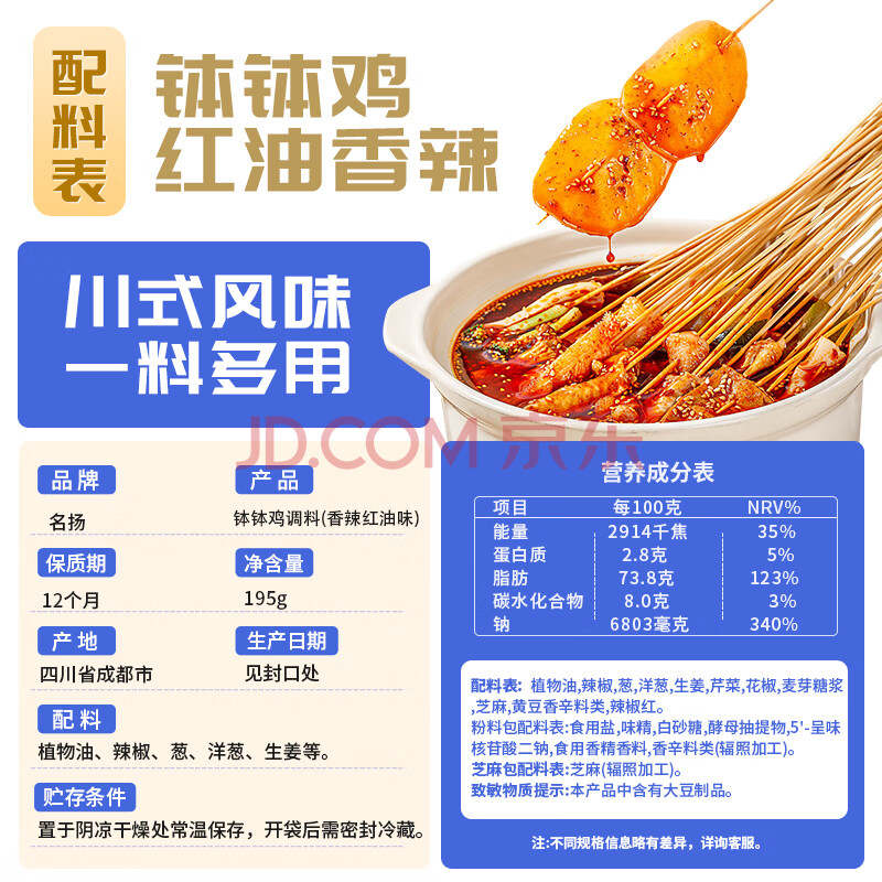 商品相册:名揚名扬钵钵鸡调料195g香辣红油味家用冷锅串串麻辣烫底料包第