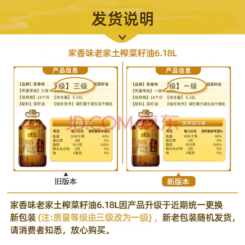 商品相册:家香味老家土榨风味菜籽油6.18L【保真菜籽油】 新老包装随机发货第
